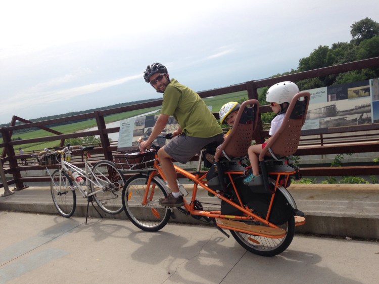 I love taking this bike out – everywhere we go we get compliment and questions. I think most people just assume that a bike trailer is the only way to ride with kids. We used a bike trailer at first, but once we found out #2 was on the way, we started to explore other options. We have discovered that a cargo bike is more enjoyable for adults and kids alike for a few reasons: A. it is lighter and easier to turn on a fully loaded cargo bike than you’d think. B. The cargo bikes can be configured in a variety of ways to suit your family. C. Kid passengers are not enclosed in a hot trailer, stuck in a reclining position, but are able to sit up and interact just as the adult cyclists are able to.