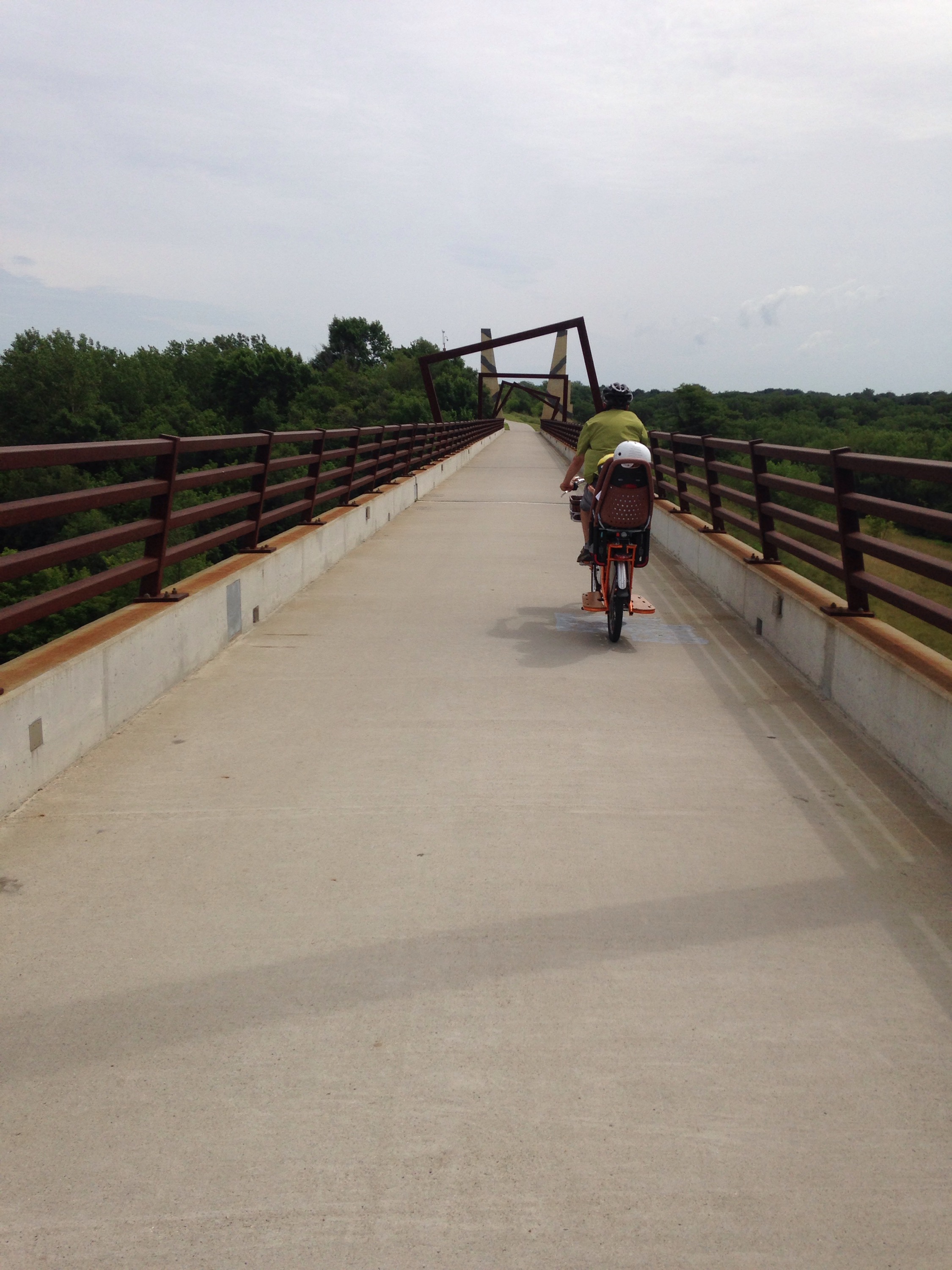 Last Sunday we finally made our way to the High Trestle Trail in Iowa. We started in Woodward, Iowa, which is about a 30 minute drive from Des Moines. We drove up after breakfast, fully loaded with snacks, water bottles, and the orange bike sticking out on either side of our car rack like an large orange dragon. We parked in the High Trestle Trail parking lot and promptly realized we left the entire diaper bag at home. So, off we road to a local gas station that was teeming with coffee sipping cyclists. It’s amazing to see what a bike trail can do for small communities. The best part – we were banking on lighter crowds due to the start of RAGBRAI.