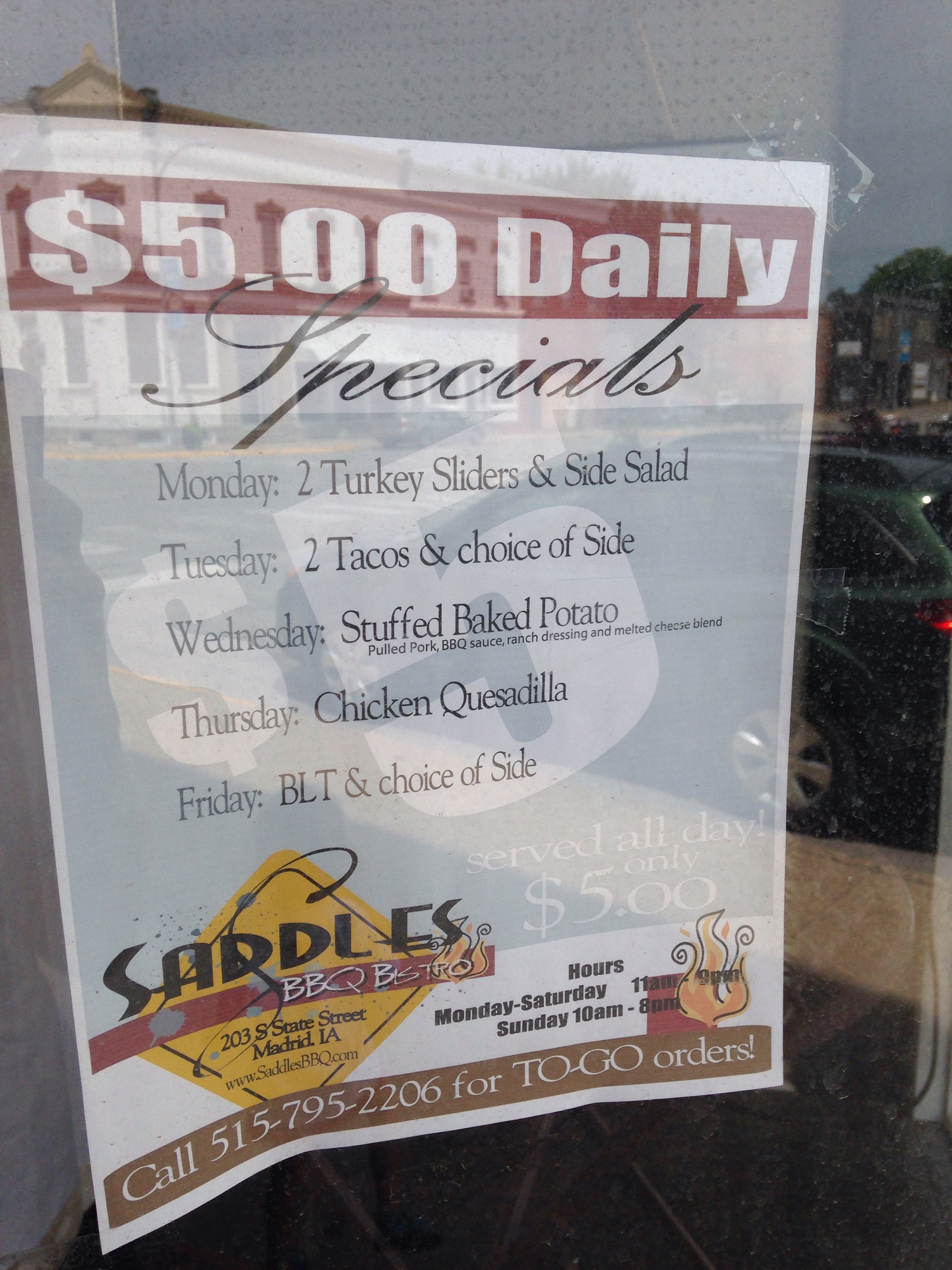 The weekday specials were prominently displayed in the front window. After finishing our meals, we packed up and headed back toward Woodward. It is only 6 miles between the two towns, so all in all, we ended up doing an easy 12 miles.