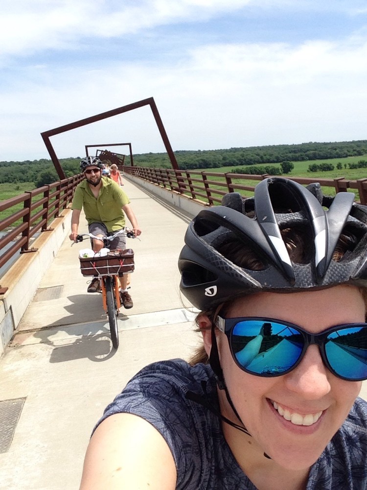 We stopped at an overlook for a selfie. Yay for not being on RAGBRAI this year, and enjoying this inaugural ride with fantastic Iowa countryside views. As you can see, the bridge is deserted! It was not this empty on our return ride after noon, though.