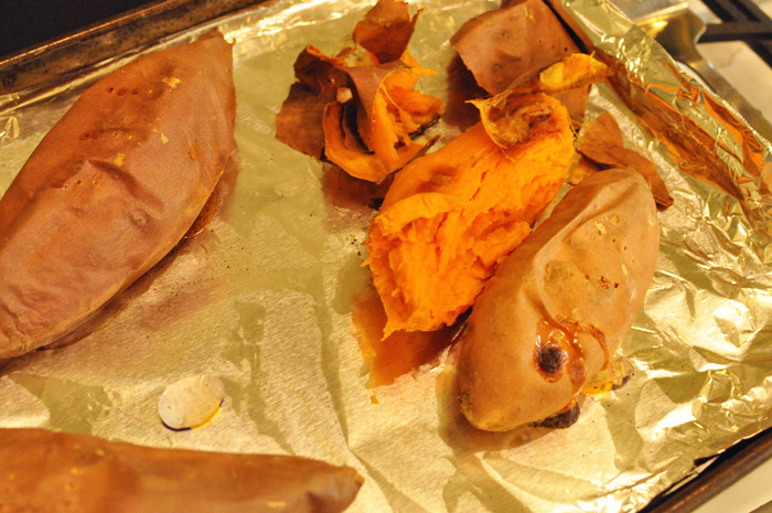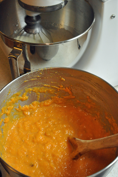 I started by roasting 5 medium – large sweet potatoes at 425° for 30 – 40 minutes or until soft.  Or you could skip to canned and puréed sweet potato.