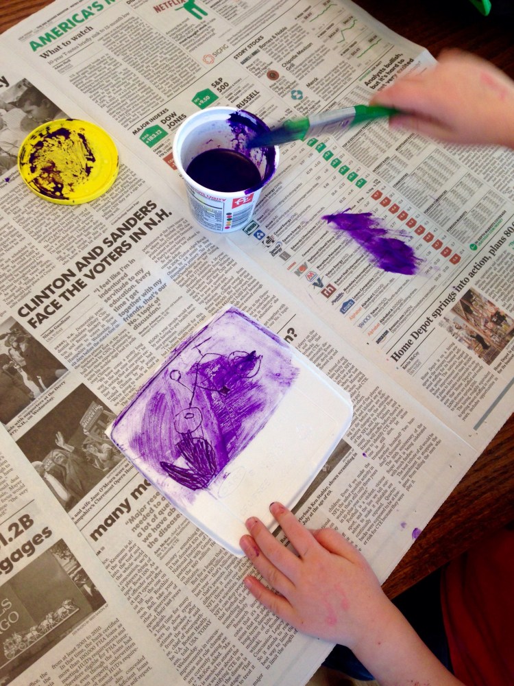Our favorite project so far, was using clean foam take-out boxes and cutting them into squares. Then, my daughter drew into the foam with a pencil, pressing hard to make deep lines. Her motif for this print is a bicycle and a heart. No take-out boxes? You can buy foam trays too.