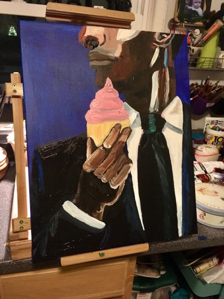This is a painting I did for my sister, as a Christmas present. I painted a woman in a similar style, dressed to the nines, holding an axe. It now hangs in her office. I really enjoyed that particular painting, and the idea of juxtaposing femininity with a stark axe. So, I decided to juxtapose suit and tie masculinity with a pink frosted cupcake.
