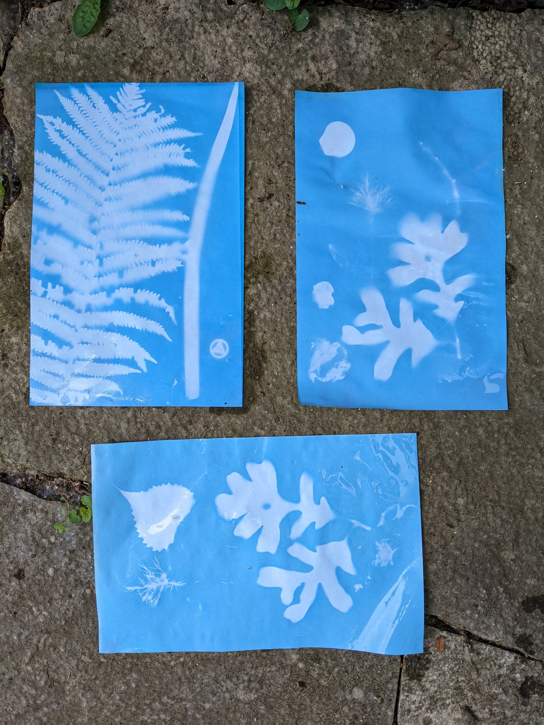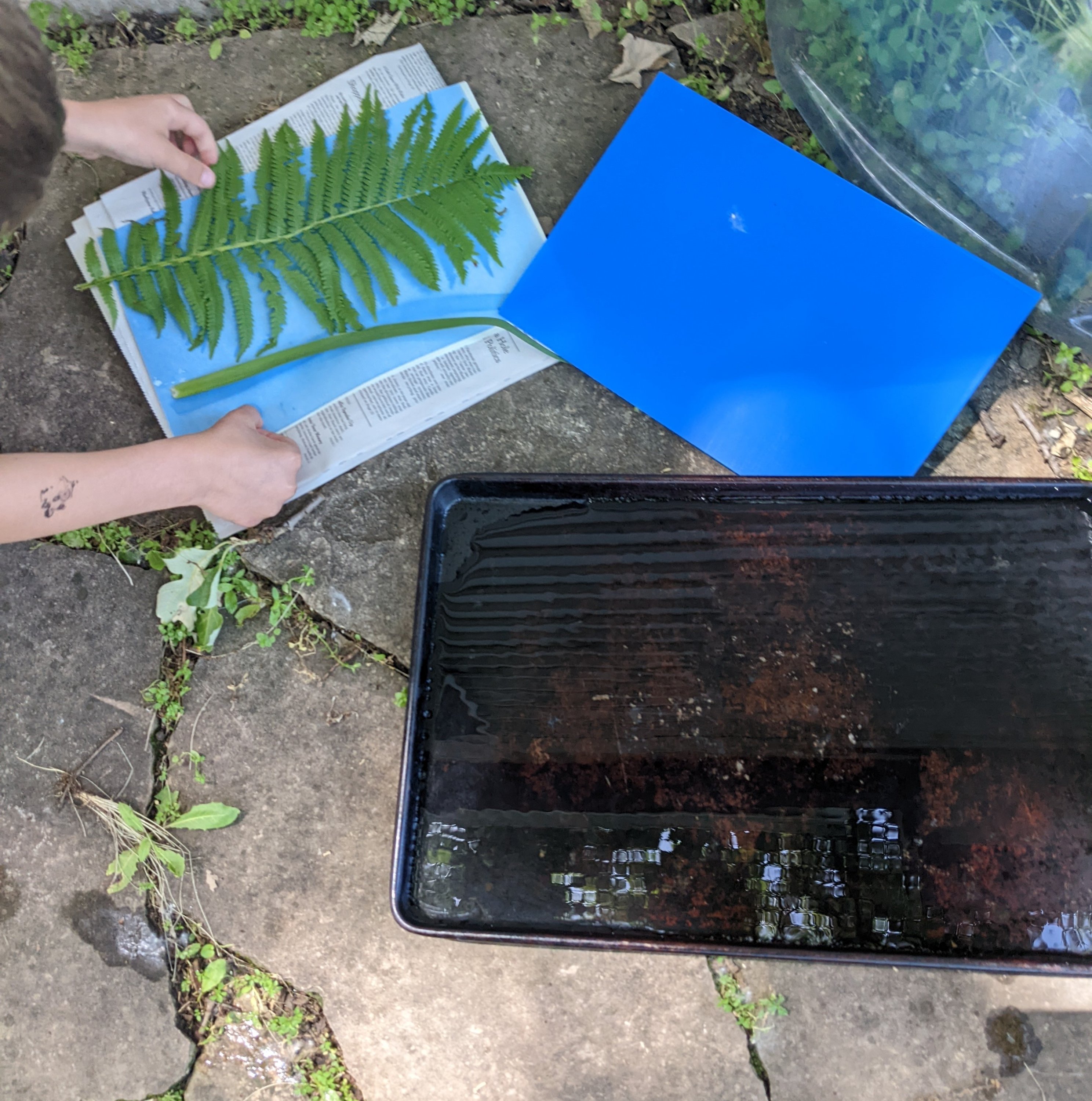 I always strive for outdoors and creative play rather than screen time, in an effort to prevent my kids from becoming screen zombies during the most beautiful weather of the Midwest summer. I don’t know about anyone else’s kids, but mine turn in heaps of sobbing and arguing messes after any amount of screen time. Nature art to the rescue. Specifically sun prints, also known as cyanotypes. What I love about these prints is that they are process-oriented. All of my favorite creative activity for kids are process-oriented, meaning the process is truly more important than the outcome. There is no copying of a subject (for example, we aren’t all trying to create a print of a smiley face).