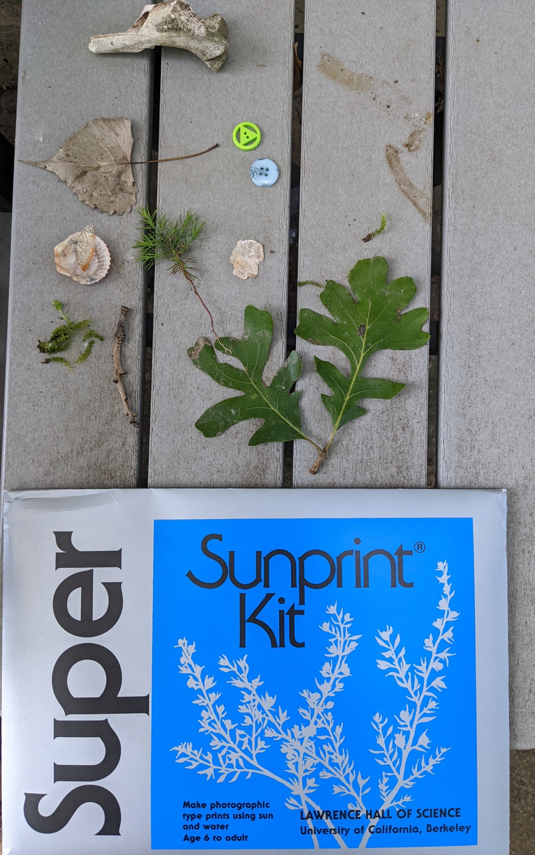 We started by gathering some materials. Look for items that have differing edges, negative space, translucent, and mostly flat. Buy your own Sun Print paper or create your own. You can see some historical examples and learn about the history of the cyanotype from the Getty.