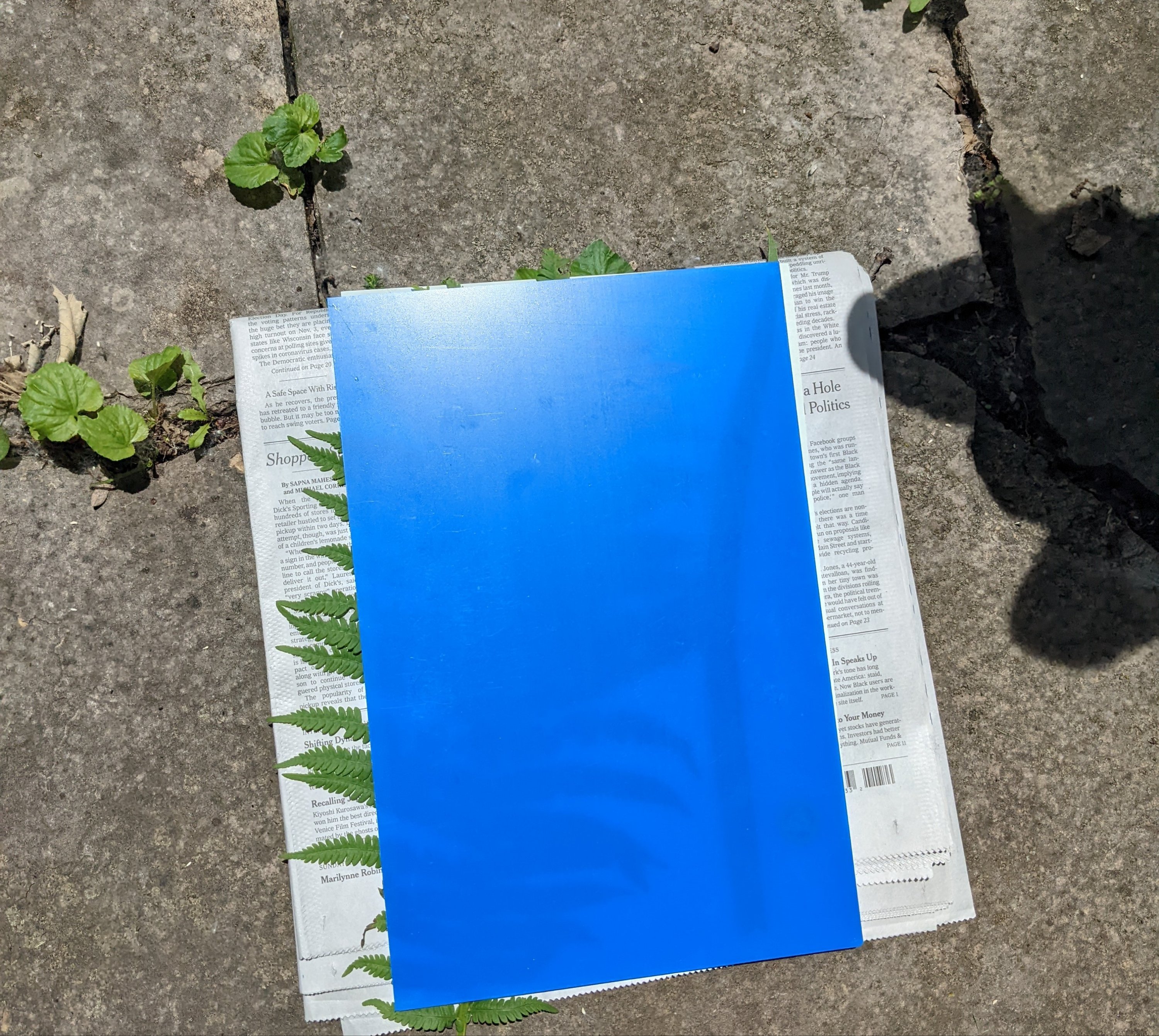 We used newspaper sections, but cardboard works too. Working in the shade, place the sheet of cyanotype paper on the newspaper, blue side up. Arrange your items quickly. Place the piece of plexiglass (blue and provided in this kit) on top. Place in the sun for 4-5 minutes. Watch the print to see when it turns white. I used a small section of the edge of the paper to ensure I did not over expose the paper.