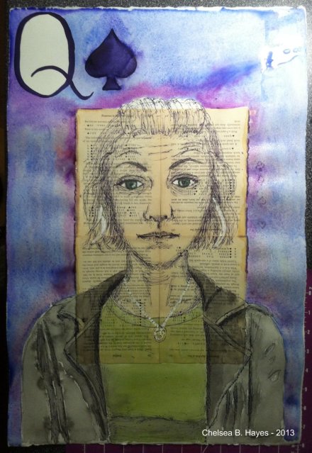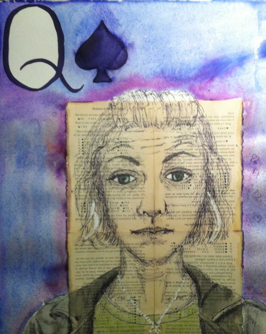 The following day, Sunday, I finished this artwork. I knew if I let it sit any more than that, I would not get back to it at all. I went back to the card theme and turned myself into the trumping Queen of Spades.