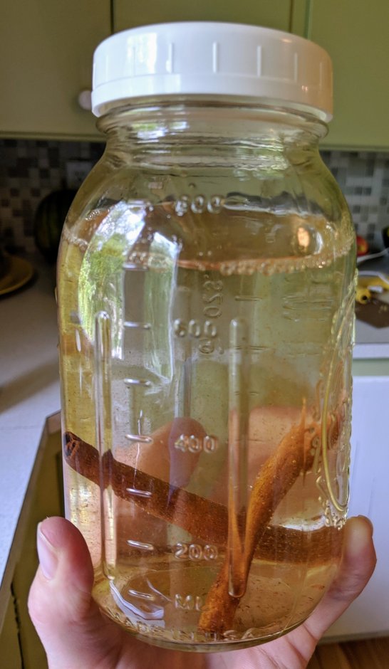 I started with a large glass jar and filled it with white vinegar. I dropped in two cinnamon sticks