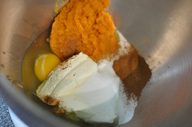 Combine 2 eggs, 1-1/2 cups mashed banana and pumpkin puree, 3/8 cups molasses, 1 cup sugar, 1/2 oil or melted butter. Stir just until moistened. Pour batter into prepared loaf pan.