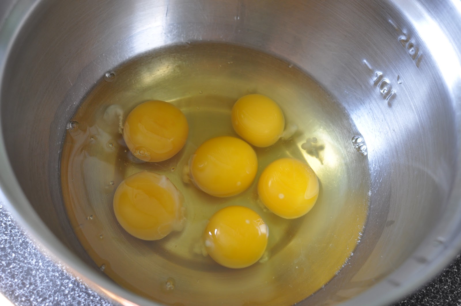 Whisk six eggs in a large bowl.