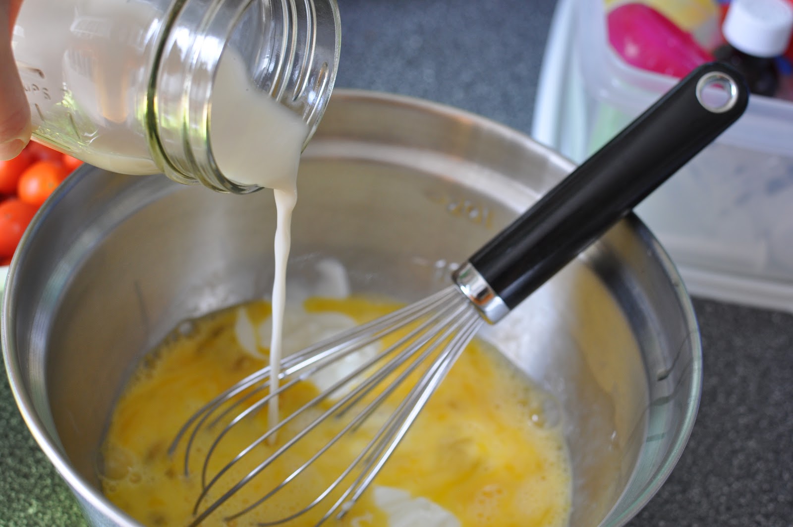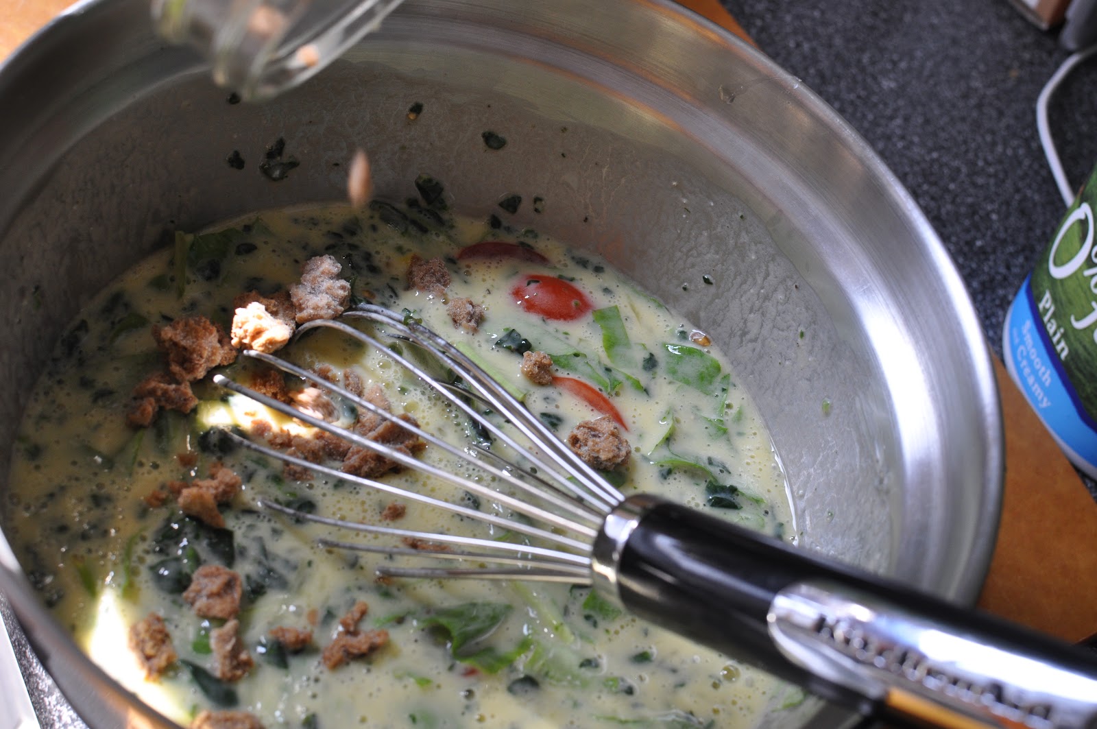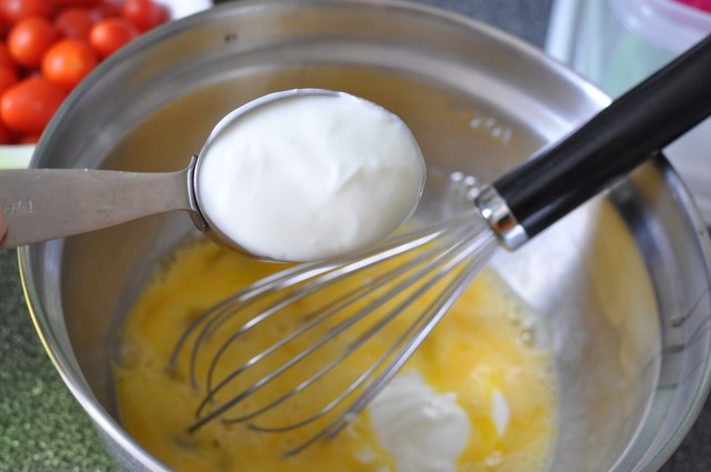 1. Whisk six eggs in a large bowl. Whisk in 1/2 cup milk and 1/2 cup plain low-fat yogurt with the eggs. Season to taste with freshly ground pepper and salt.