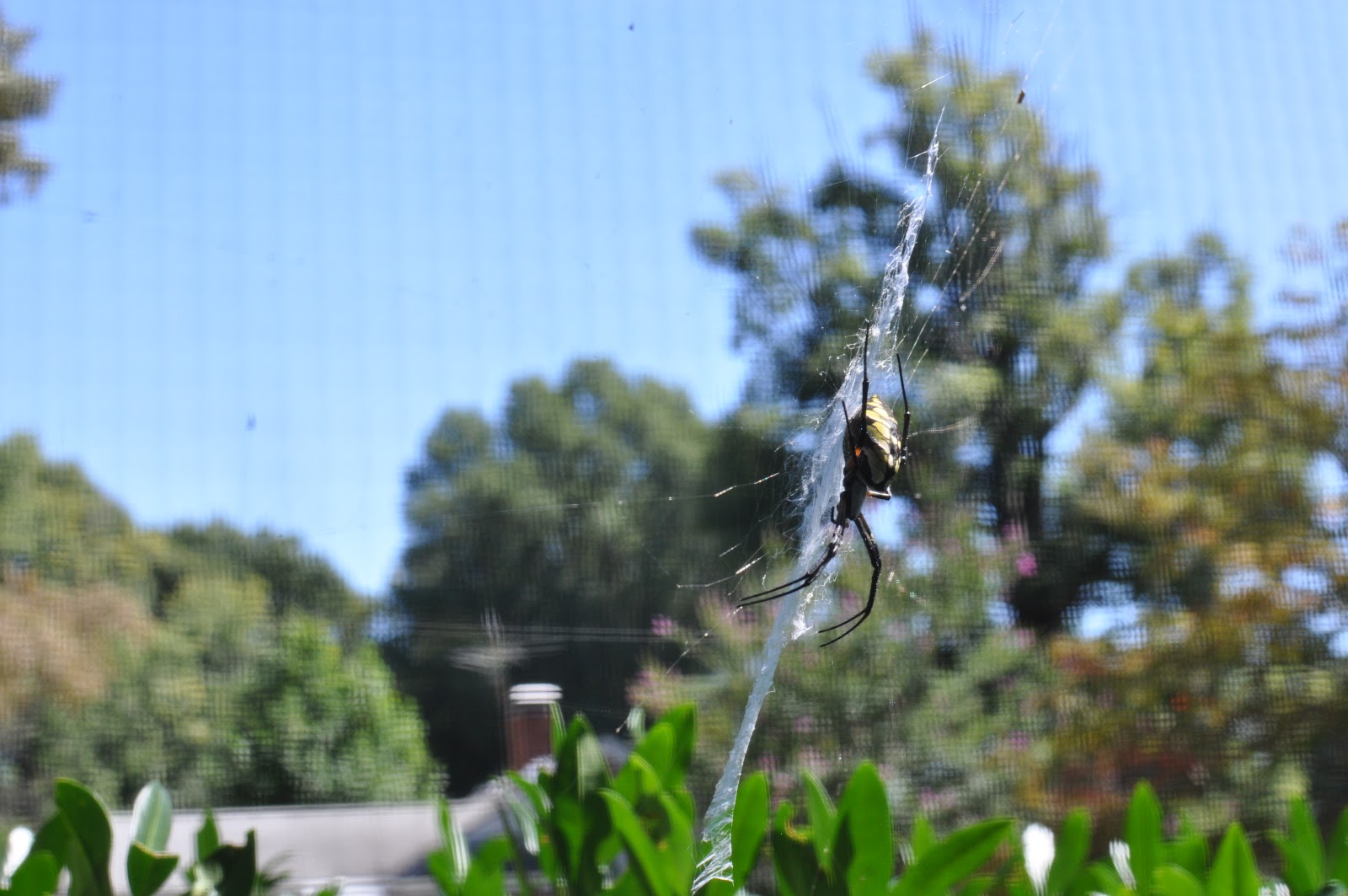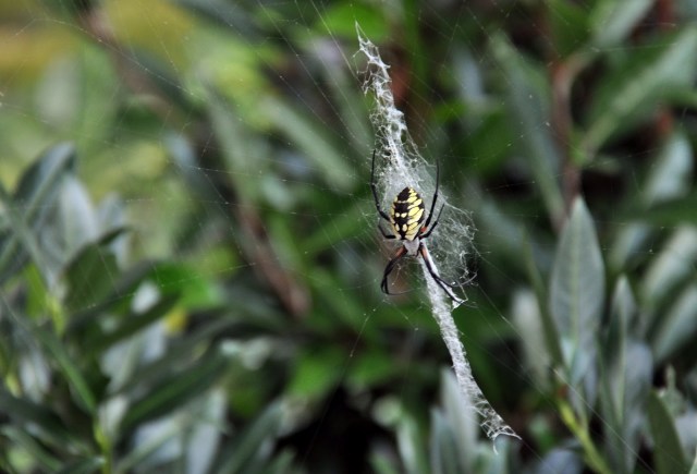 The return of the black and yellow argiope (Argiope aurantia) is another tell-tale sign of autumn. These beauties show up every fall in bushes, hostas, and sides of houses. The ones this size are female and will grow up to an inch and half long. These spiders are harmless to humans, in fact they eat many insects and actually are quite helpful in ridding gardens of pests.