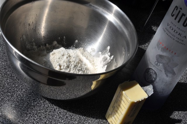 1 tablespoon of the ice cold water (or vodka) over part of the flour mixture; toss with a fork. Push moistened flour to one side of the bowl. Repeat, using 1 tablespoon of the liquid at a time until all the flour is moistened. Form dough into a ball.
