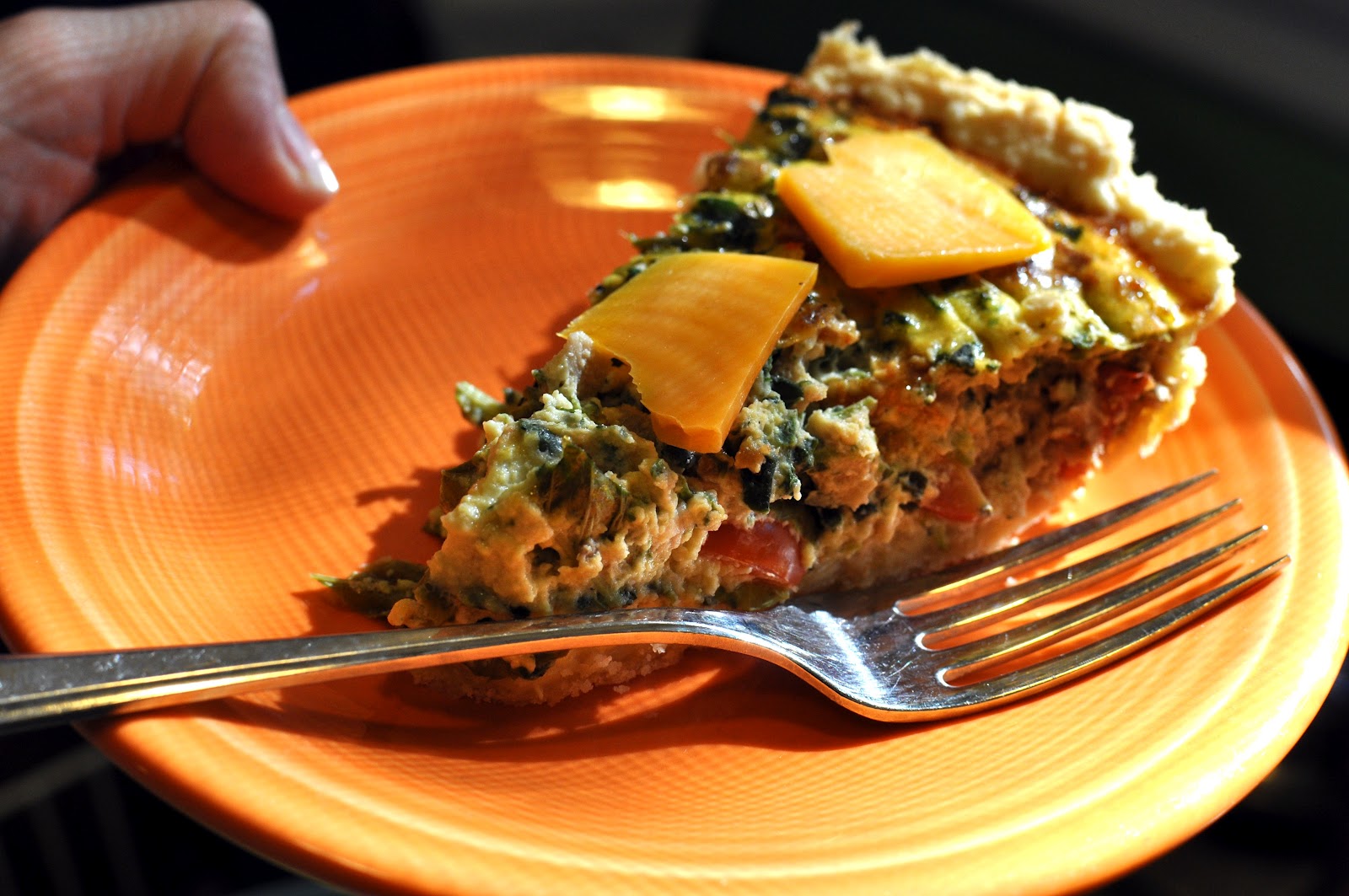 I served this quiche warm with sliced, aged cheddar on top. Cheddar is great cheese due to its natural lack of lactose.