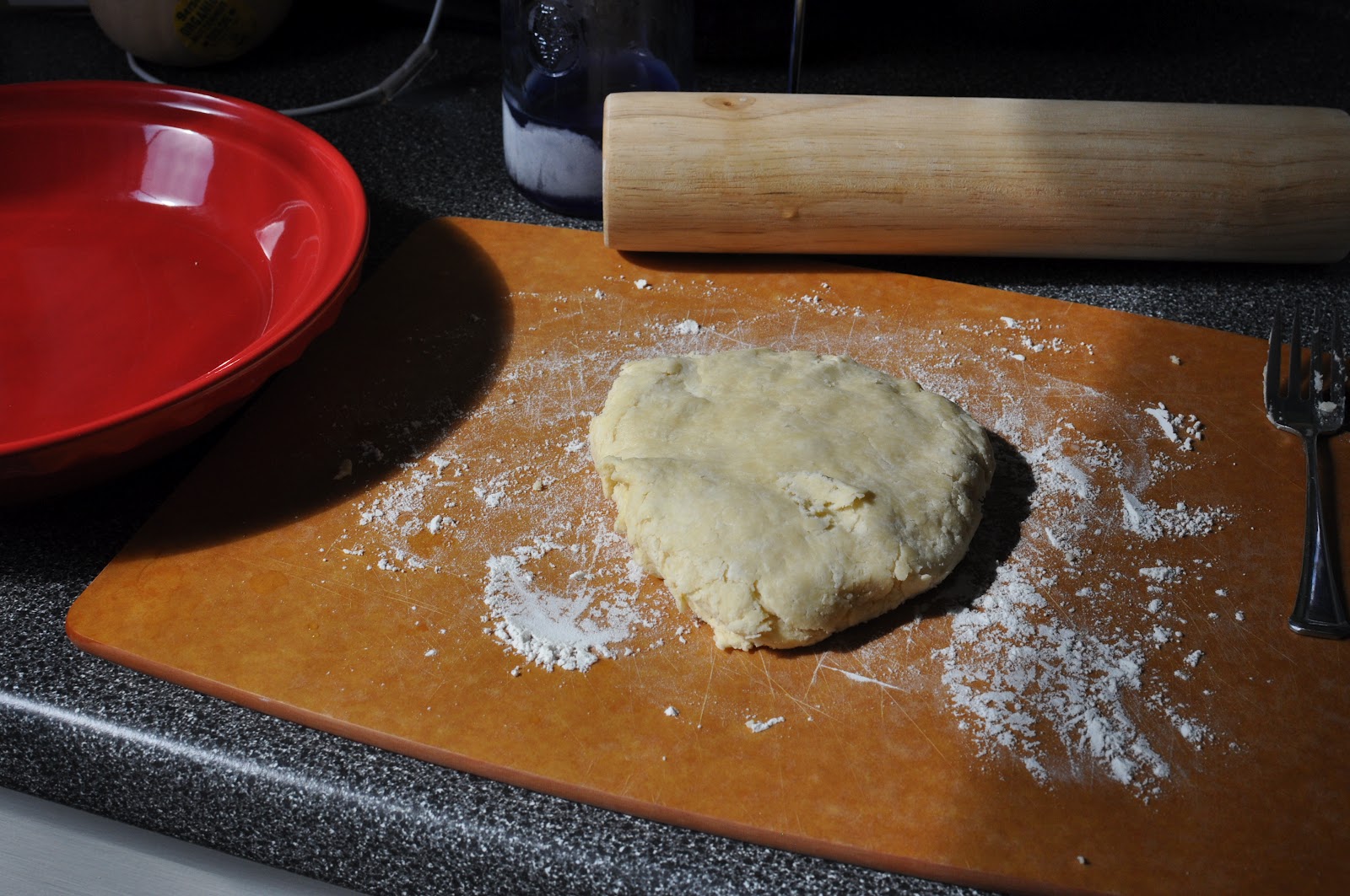 Sprinkle 1 tablespoon of the ice cold water (or vodka) over part of the flour mixture; toss with a fork. Push moistened flour to one side of the bowl. Repeat, using 1 tablespoon of the liquid at a time until all the flour is moistened. Form dough into a ball.