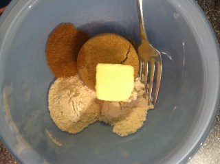 1. Using a pastry blender, cut in 1/3 cup butter into 1-1/4 cups flour. Pieces should be pea-sized.