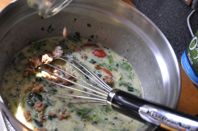 Mix in 2-3 cups chopped fresh spinach. I also used about 1/3 cup frozen spinach, because I was short on fresh spinach.